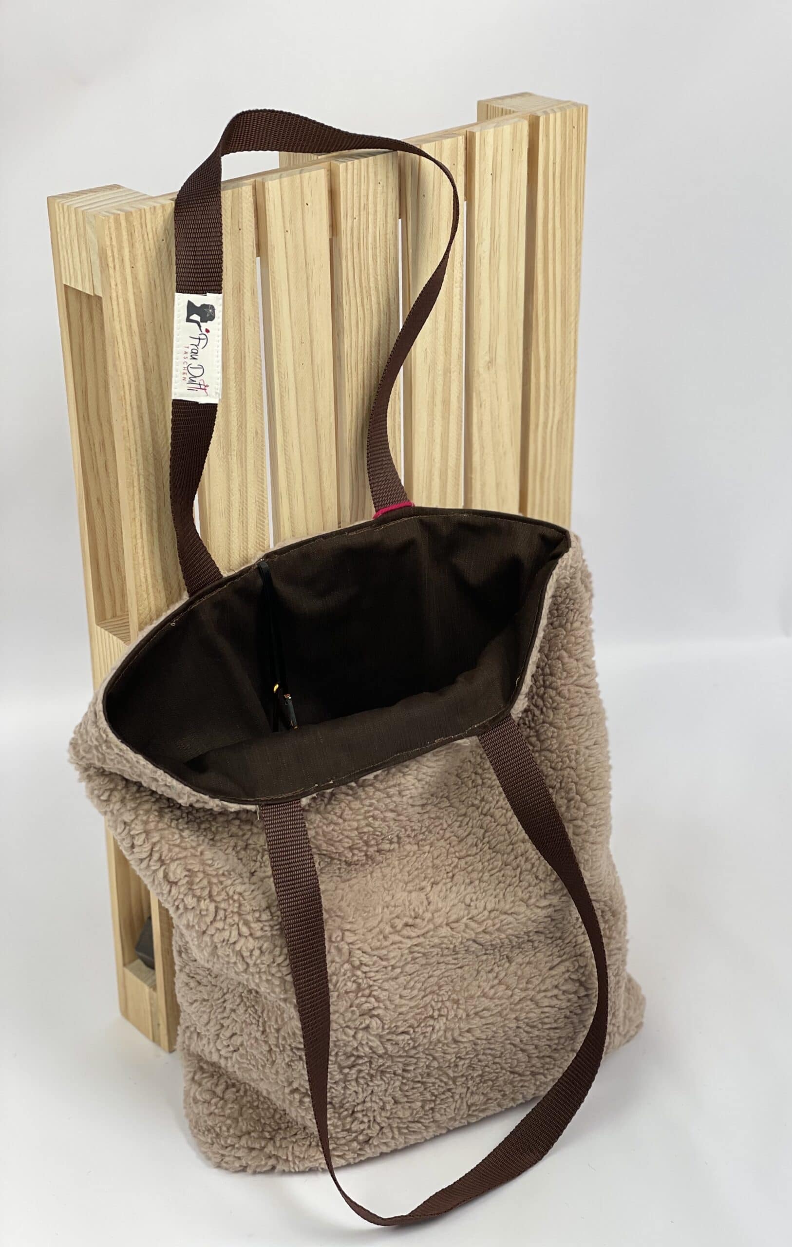Innenstoff Braun in Jeansqualität, hellbrauner Teddystoff flauschig, Träger Polypropylen